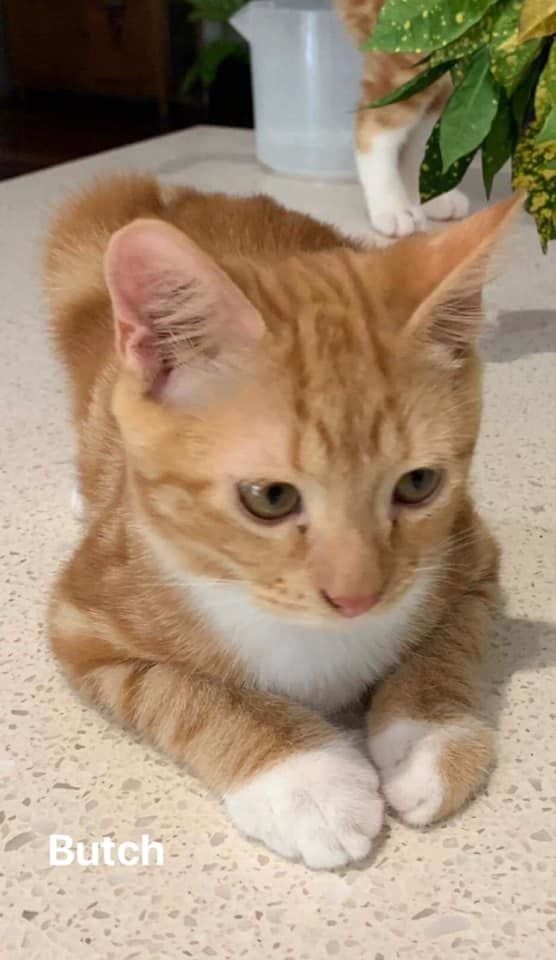 Butch is a gentle, sweet little ginger boy. He loves cuddles and will demand them until you give in. Then he will cuddle up beside you. He is curious and confident and loves playing with his siblings. He is not scared of the dogs, but not best mates yet. He hasn't been around young children.