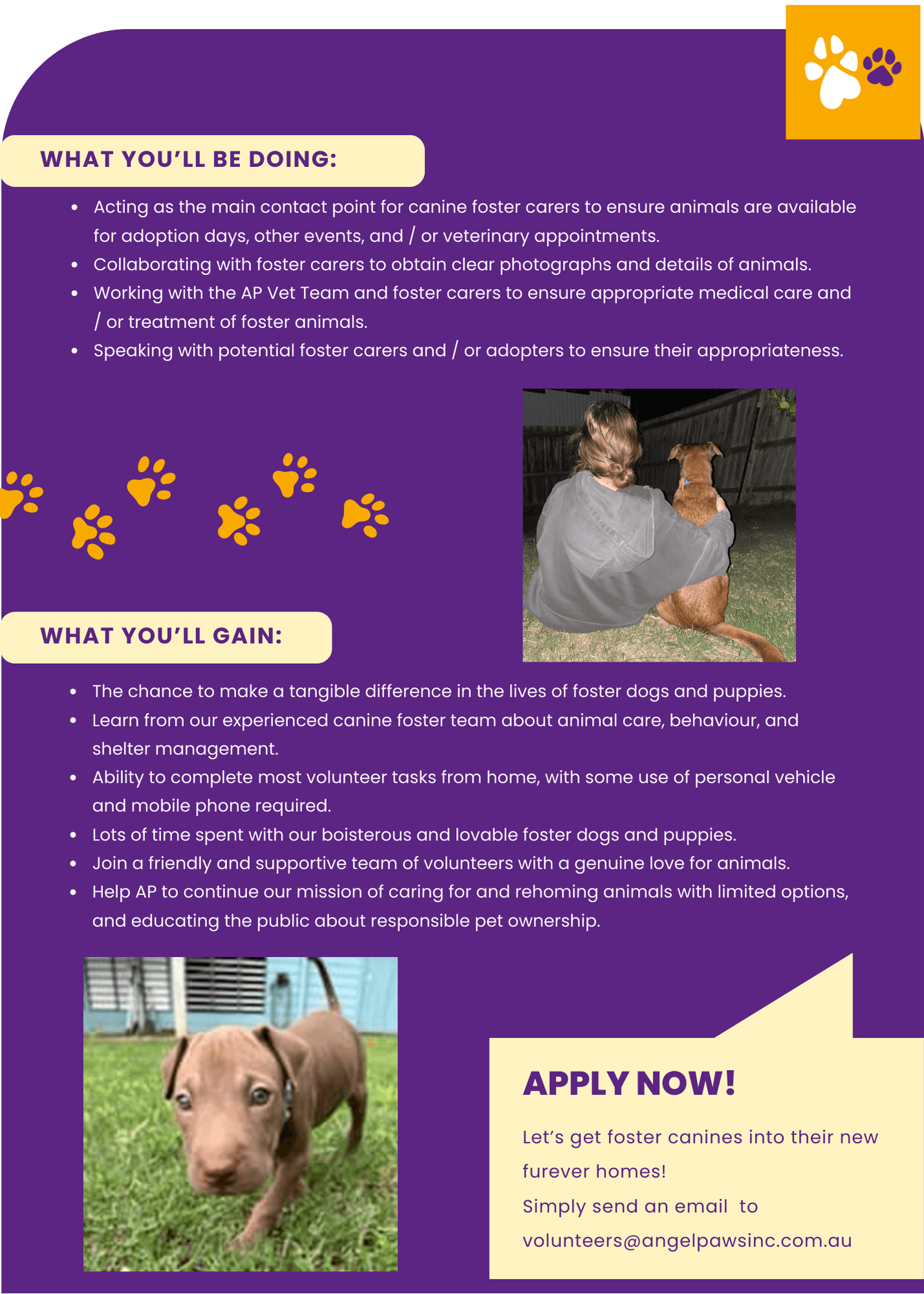 If you have any questions about our specific requirements for volunteers, please email to volunteers@angelpawsinc.com.au.